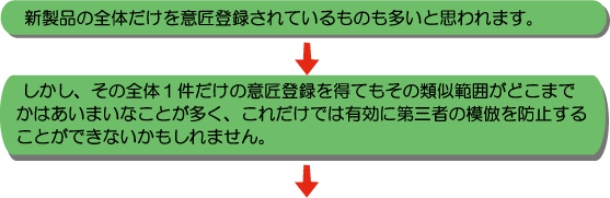 新製品のすべてのデザインのバリエーションを第三者が使えないようにすることは困難ですが、新製品の周辺のある程度の範囲であれば、関連意匠制度や部分意匠制度を用いた複数の意匠登録の取得によって第三者の模倣の排除が可能な場合もあり得ます。特に機能的な製品でデサインとして変更の余地がある製品であれば、第三者からの模倣を排除するのに有効な手段となる場合も十分に考えられます。